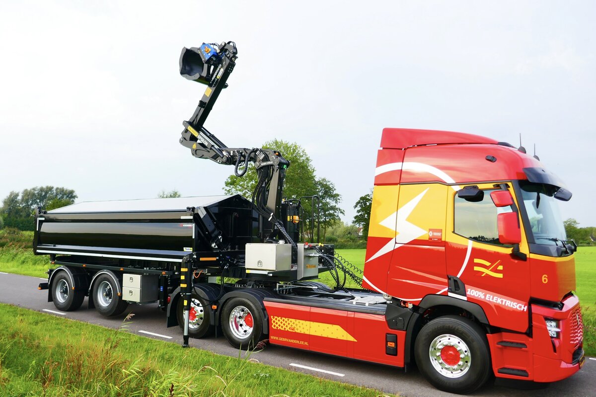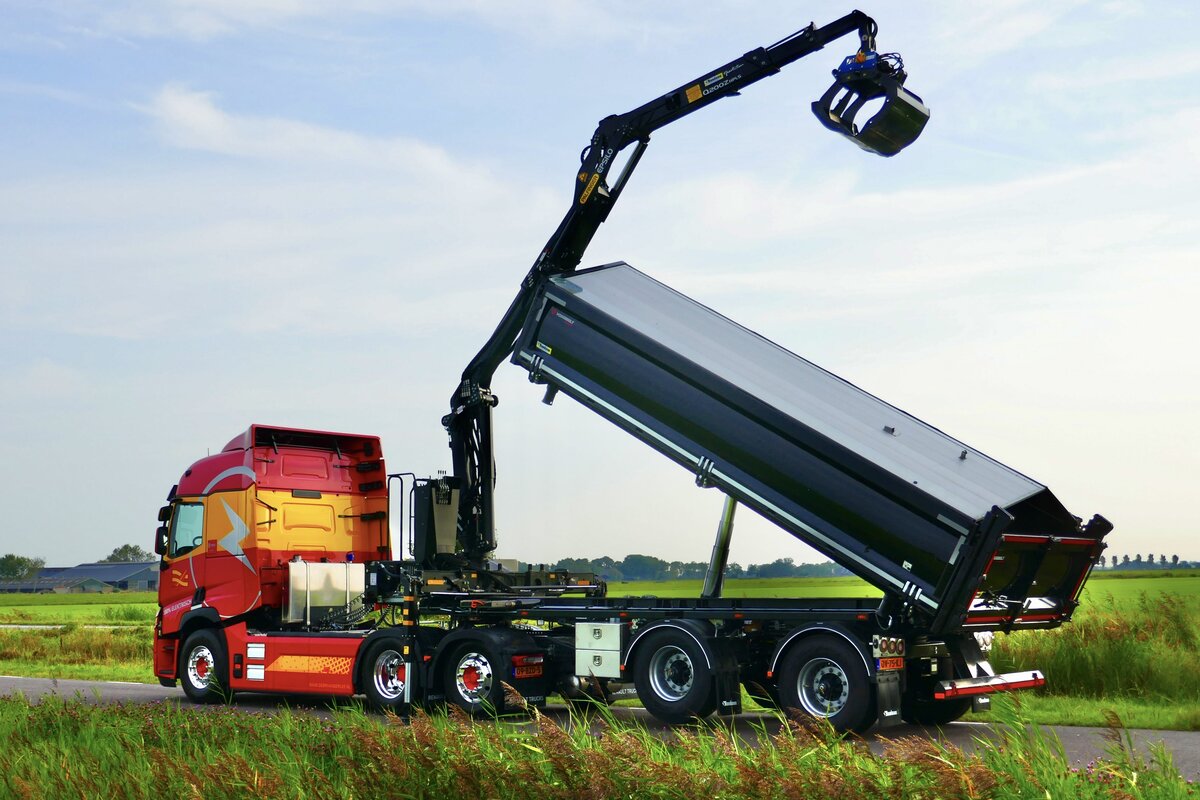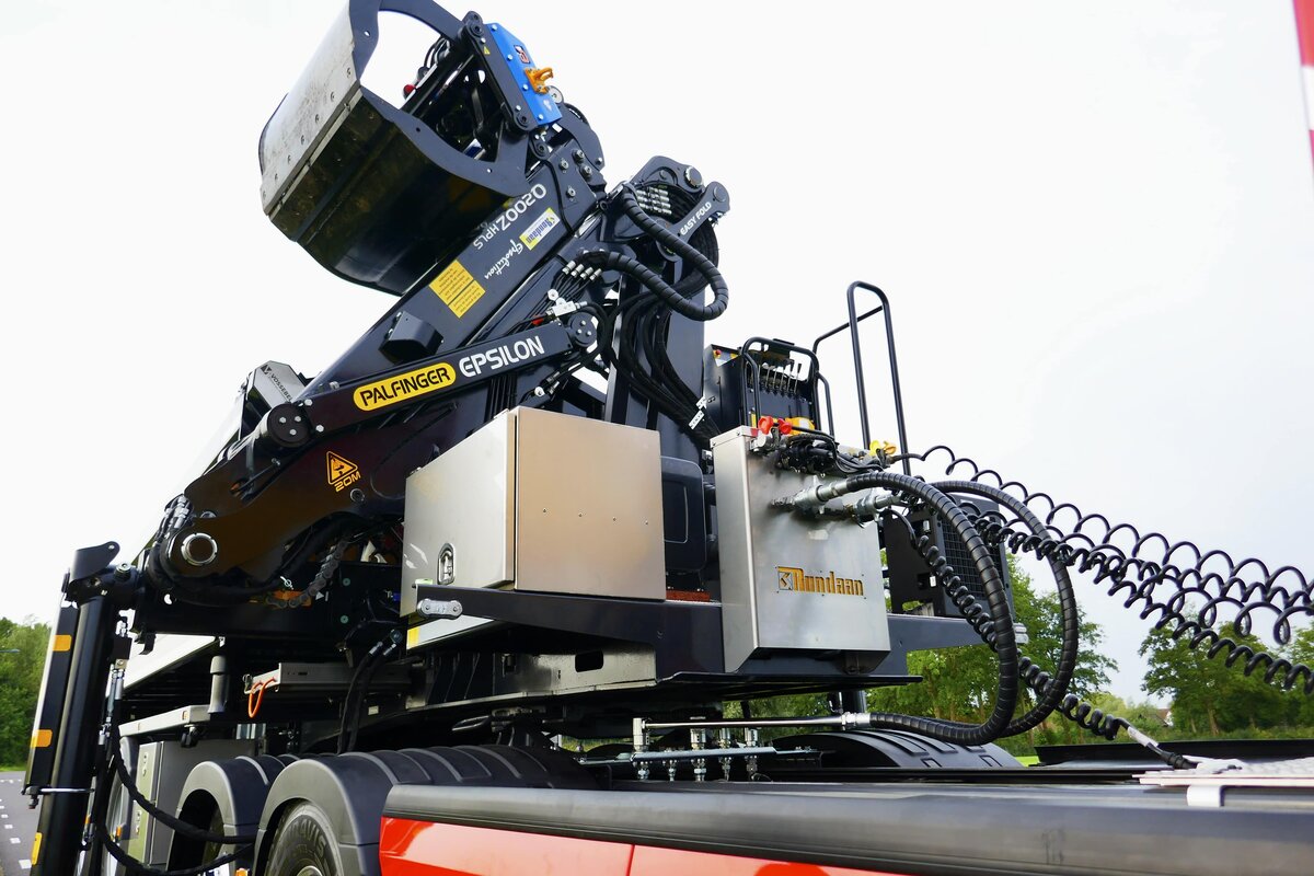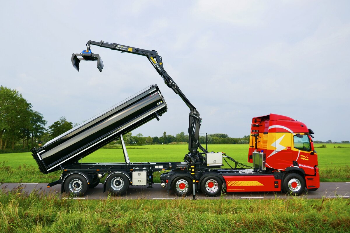 Het resultaat is een vernieuwde, 2-assige Rondaan RAF-oplegger met een opvouwbare Epsilon Q200Z95 Z-kraan en 2-zijden kipper, gekoppeld aan een elektrisch trekkerchassis met E-PTO. De oplegger is uitgerust met een gestuurde as voor maximale wendbaarheid, ook in stedelijke omgevingen, en voldoet aan de wettelijke voorwaarden voor een hoger totaalgewicht dan een traditionele kraanbakwagen. Zo blijft het laadvermogen behouden, ook bij elektrische aandrijving.