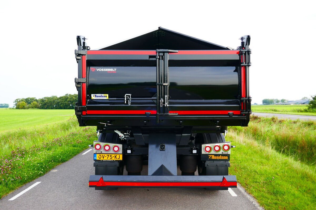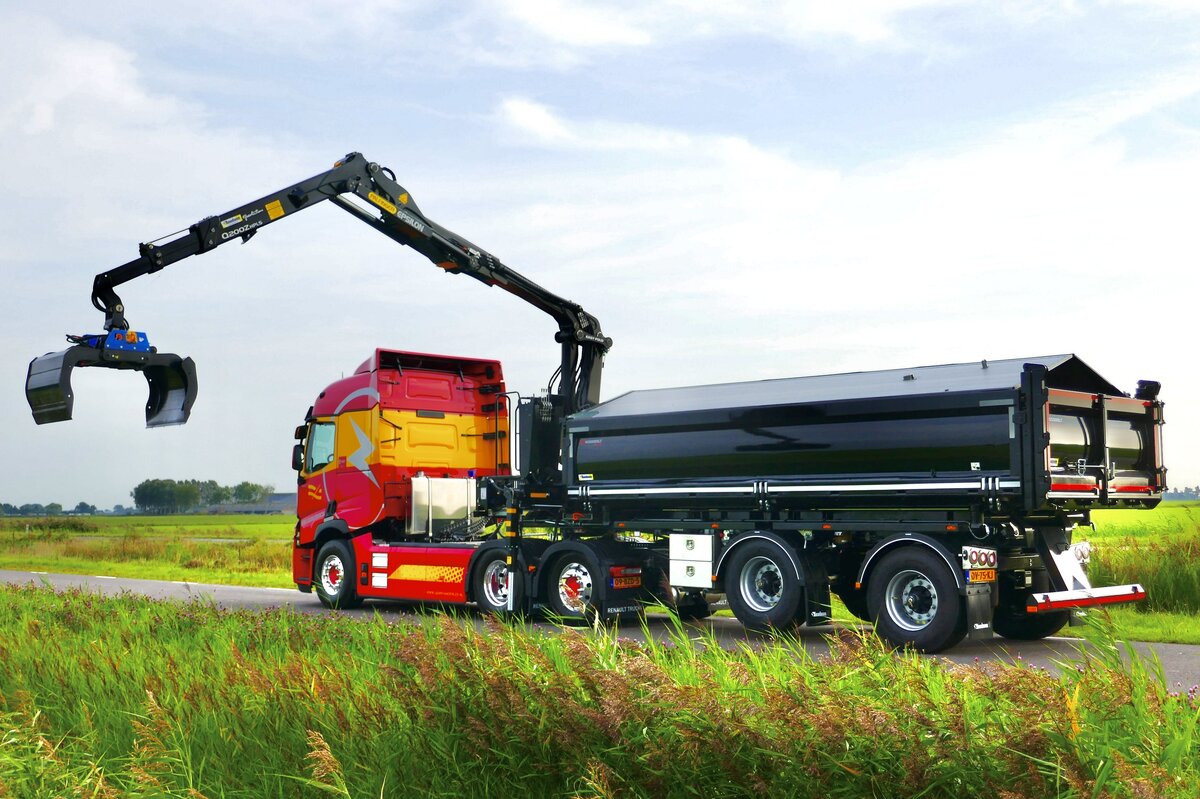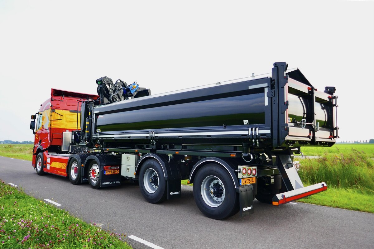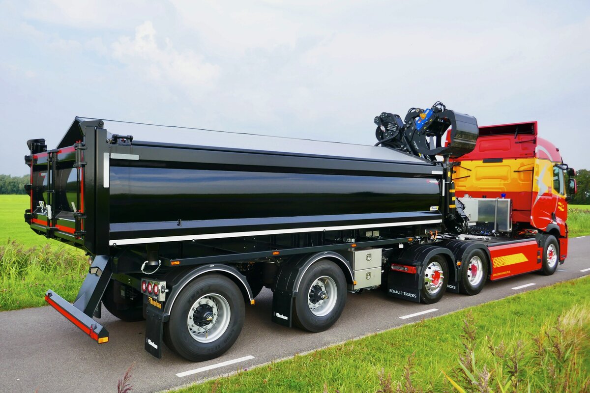 Het resultaat is een vernieuwde, 2-assige Rondaan RAF-oplegger met een opvouwbare Epsilon Q200Z95 Z-kraan en 2-zijden kipper, gekoppeld aan een elektrisch trekkerchassis met E-PTO. De oplegger is uitgerust met een gestuurde as voor maximale wendbaarheid, ook in stedelijke omgevingen, en voldoet aan de wettelijke voorwaarden voor een hoger totaalgewicht dan een traditionele kraanbakwagen. Zo blijft het laadvermogen behouden, ook bij elektrische aandrijving.