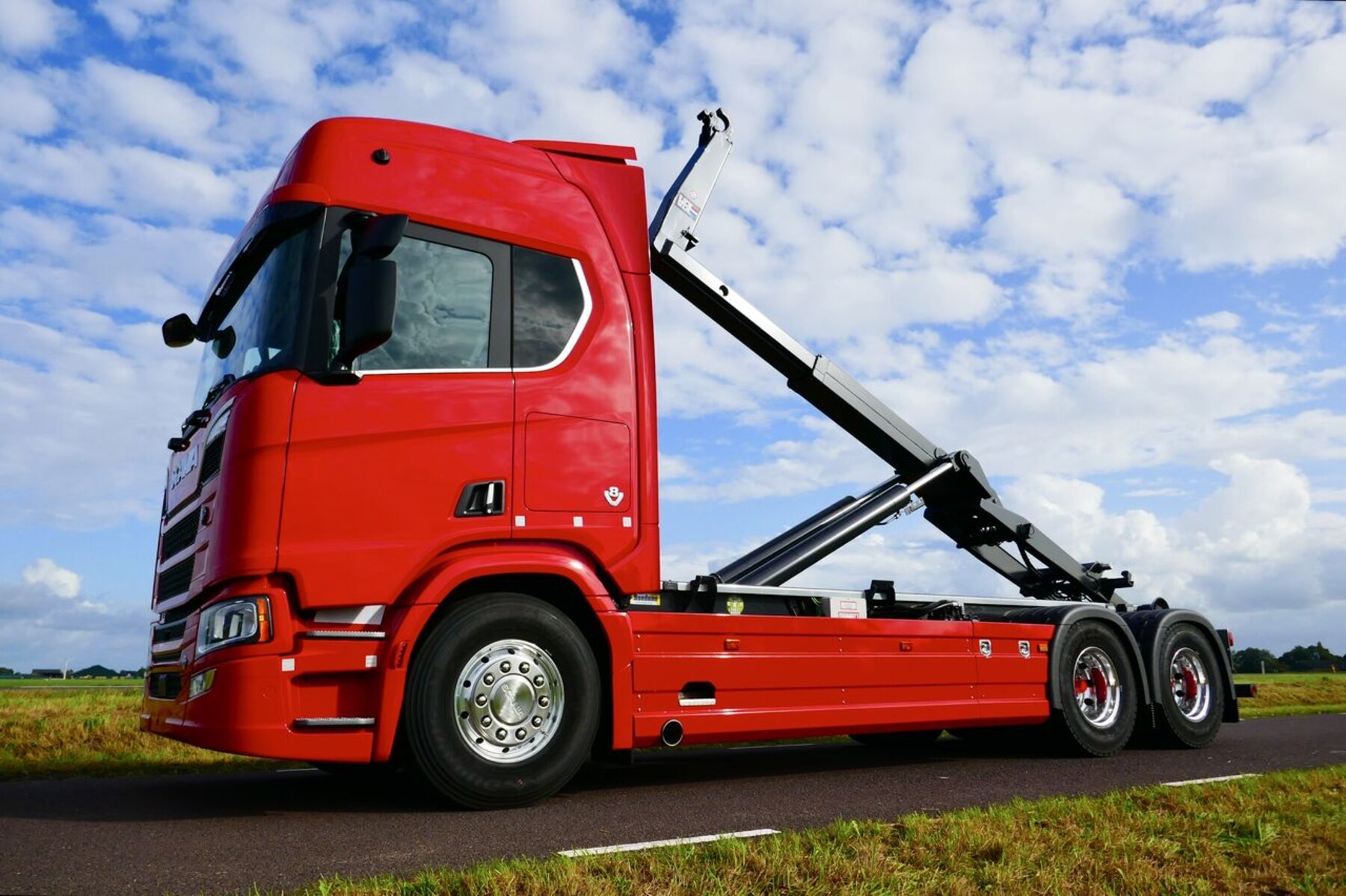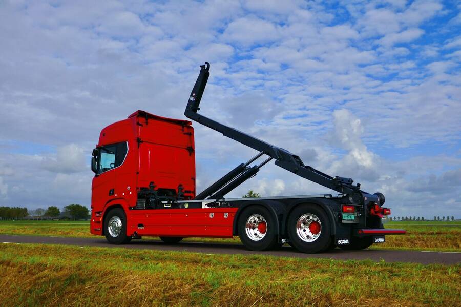 Voor P.Bloemsma mochten wij dit door Scania dealer Rinsma geleverde chassis voorzien van een VDL haakarmsysteem. Om het geheel af te maken werden er rondom sideskirts gemonteerd en in de kleur rood gespoten. Voor extra opbergruimte werd een RVS kist en een nettenrek gemonteerd.