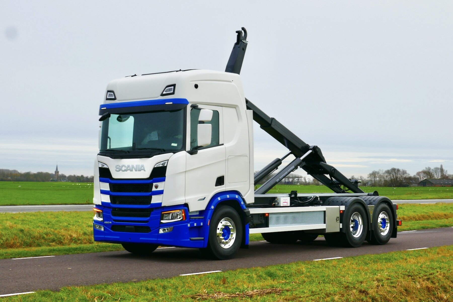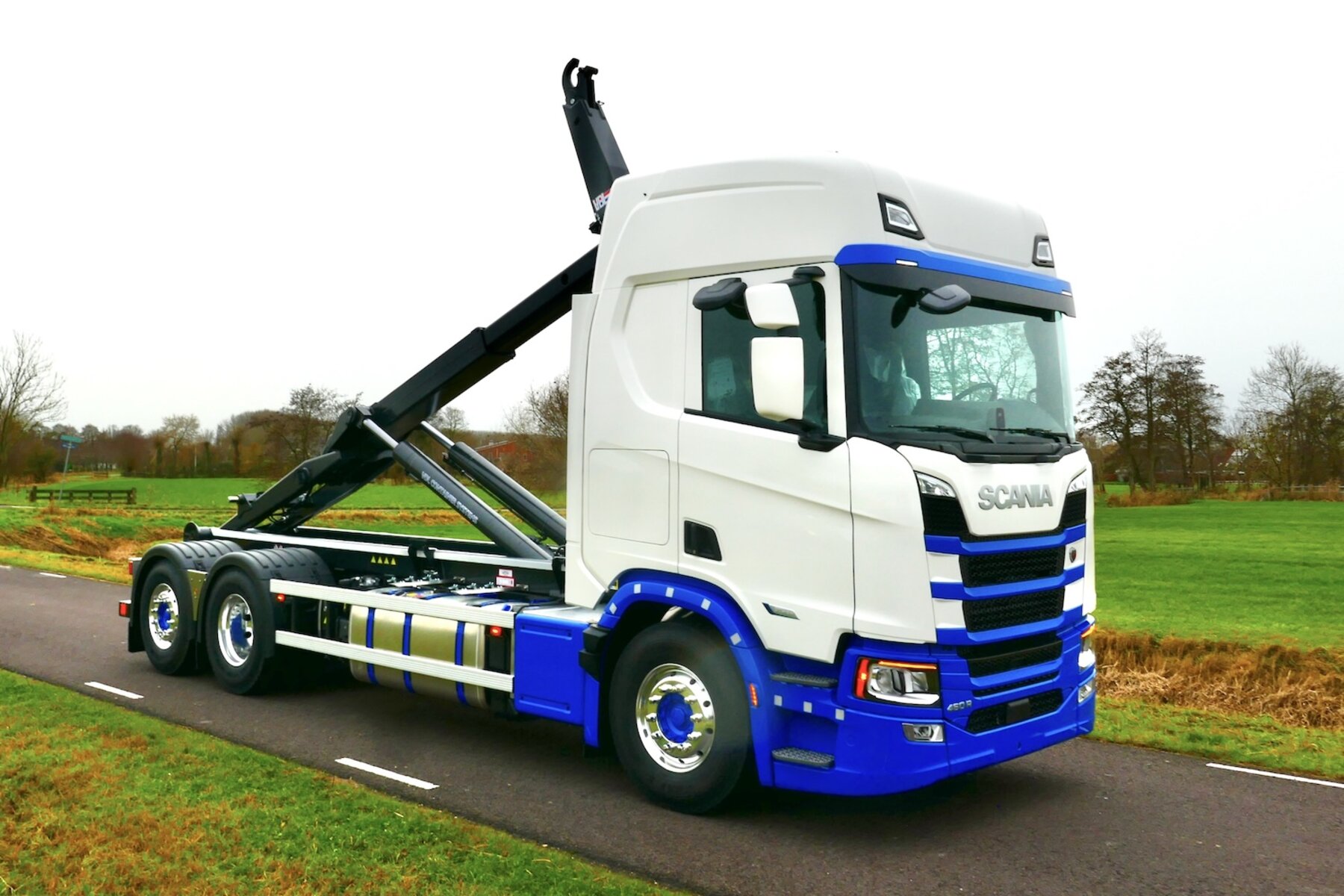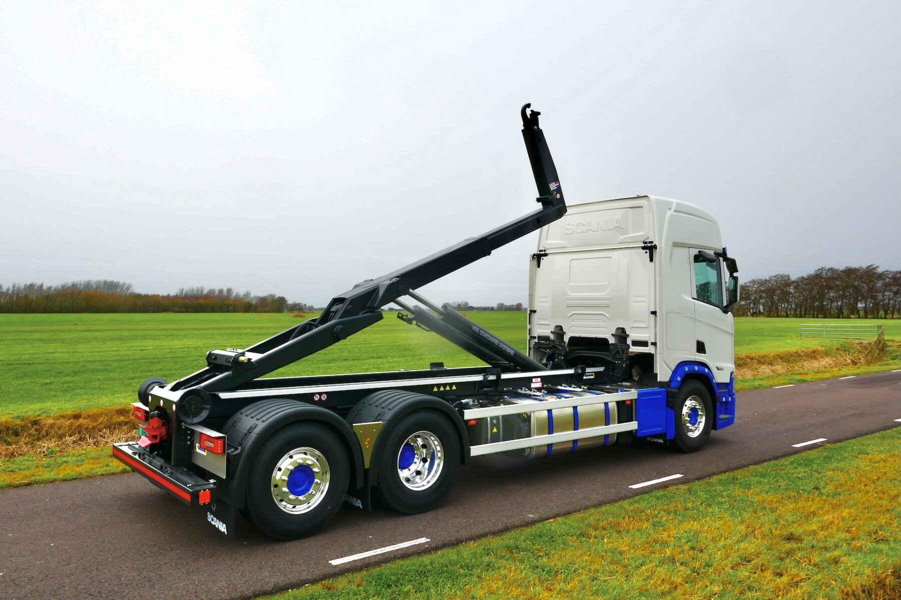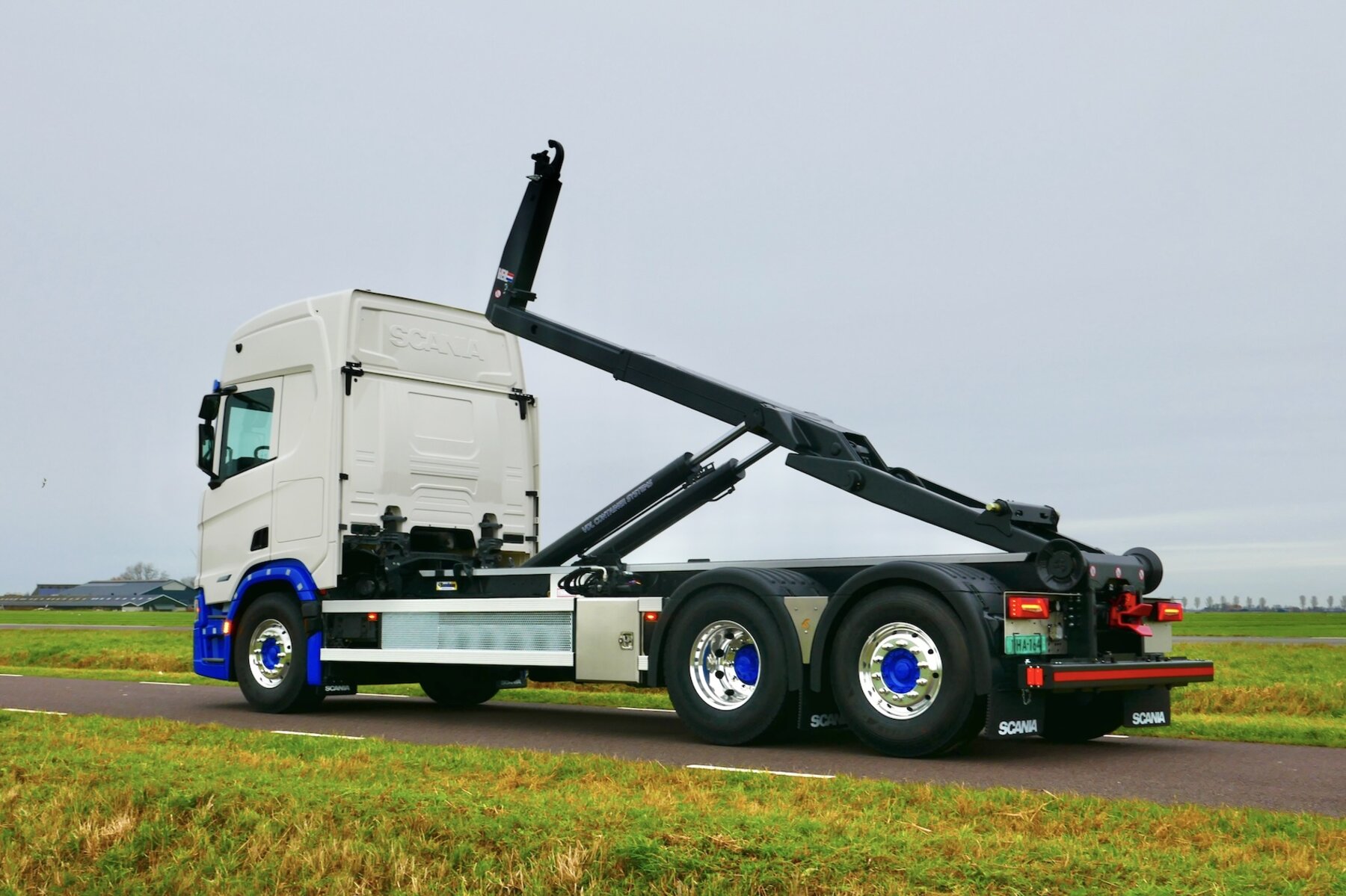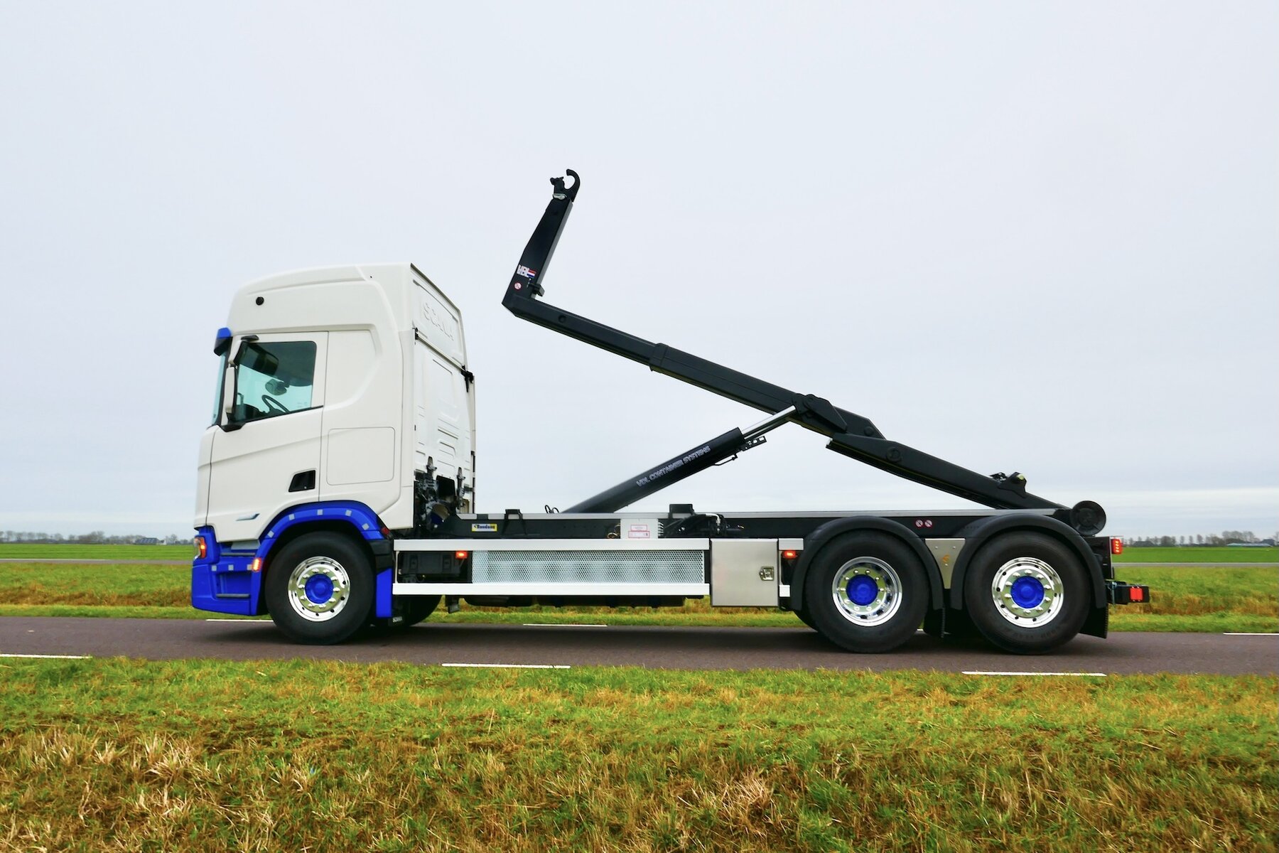Voor Schotpoort Container Transport verzorgde Rondaan de opbouw van een Scania chassis met een 21 tons VDL haakarminstallatie. De opbouw is ingericht voor overzichtelijk werken, ook wanneer de truck solo wordt ingezet.