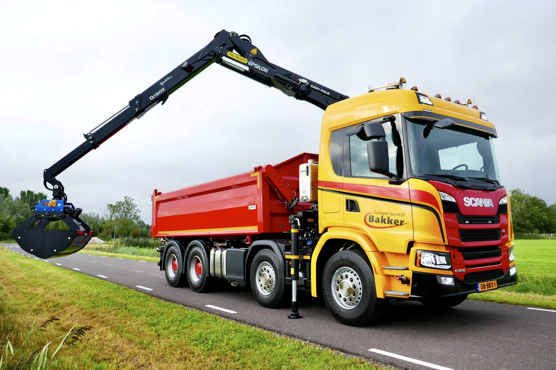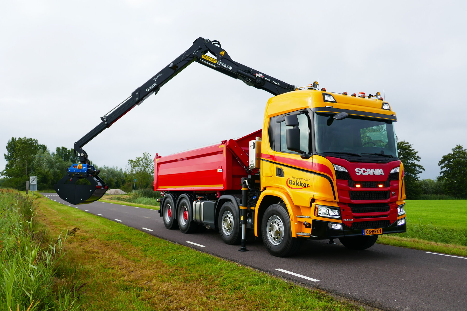 Voor Bakker Transport - Reduzum mochten wij onlangs een Scania 8x4 chassis voorzien van een EPSILON Q150Z84 Ti opvouwbare z-kraan i.c.m. een PN 2-zijden kipper. De kipper is voorzien van hydraulische afdekkleppen en een hydro-bord aan chauffeurszijde.